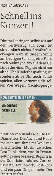 Als Ilse Lau sich vor rund fünf Jahren auflösten, machten Ilse-Lau-Bassist Fokke und Bosse als Diametrics weiter, Bosse zur Abwechslung als Gitarrist und Sänger. Als ihnen vor einem knappen Jahr der Schlagzeuger absprang, war Przygodda gerade nach Bremen zurückgezogen. Da lag der Schluss nahe, zusammen noch einmal neu anzufangen. Im November debütierten Von Wegen in Hamburg, im Januar gab es einen Auftritt in Hannover, und am Sonntag war Bremen dran.